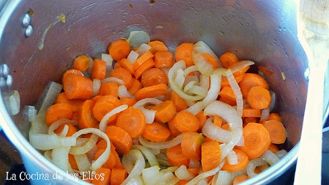 Mientras pelar y trocear las zanahorias. Añadírlo a la olla y remover. Dejar que se poche la verdura.
