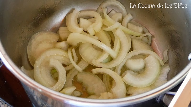 Pelar y cortar la cebolla en rodajas. Sofreír con el aceite a fuego moderado en la olla a presión.
